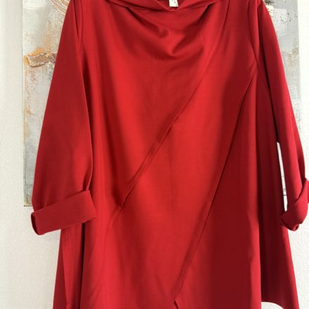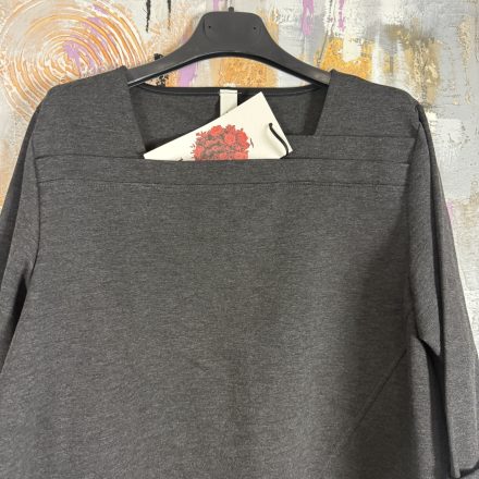 Blusa modello svasato a girocollo, leggermente asimmetrico. Molto simpatiche le tasche applicate sui lati col bottone. Disponibile in taglia unica, veste fino alla taglia 48.