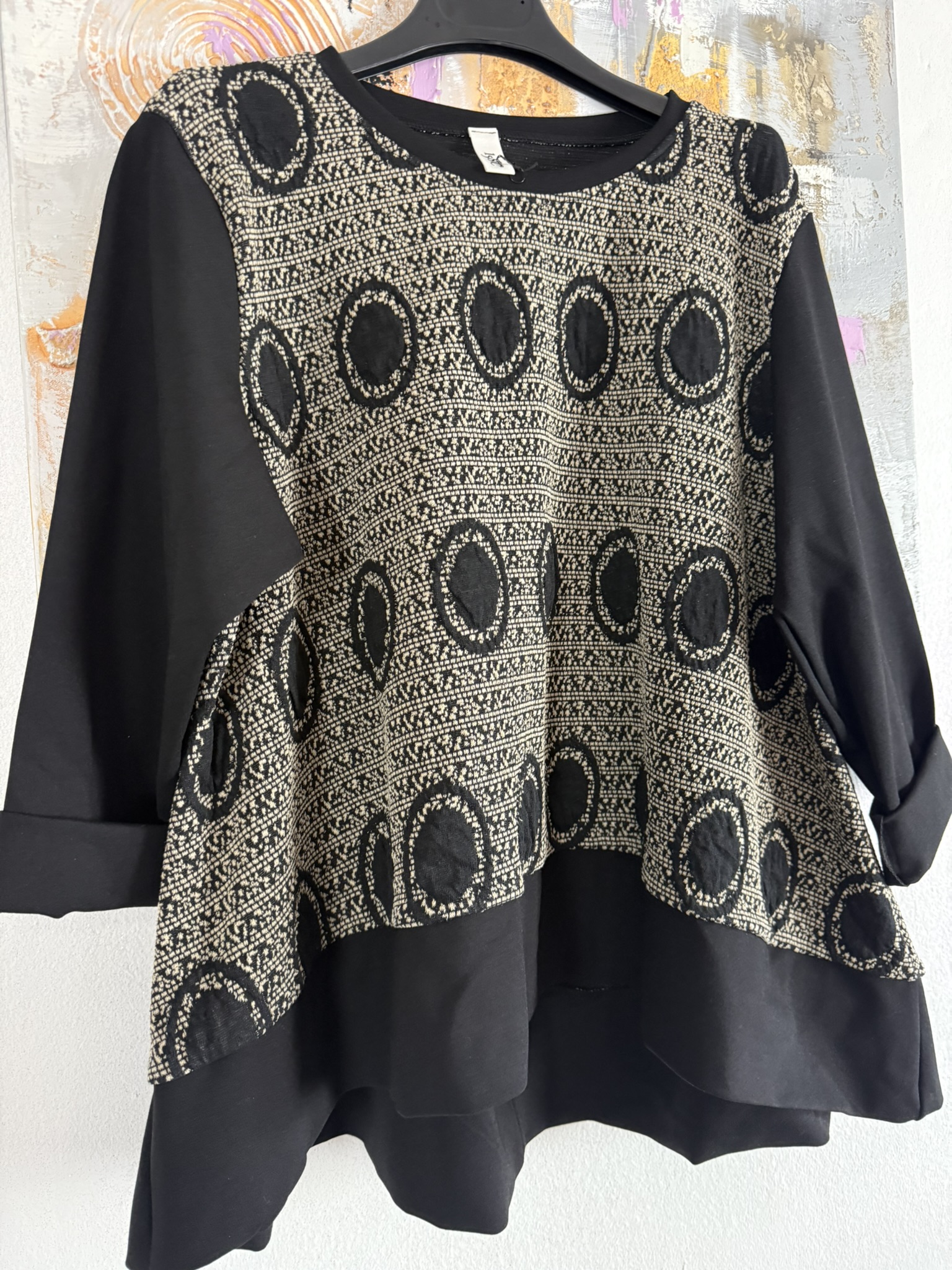 Blusa a girocollo, modello lavorato sulla parte davanti, la parte dietro è liscia, scende svasata. Disponibile in taglia unica, veste fino alla taglia 46/48.