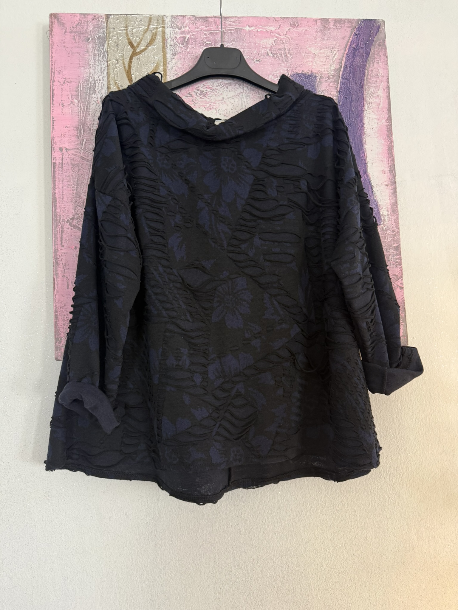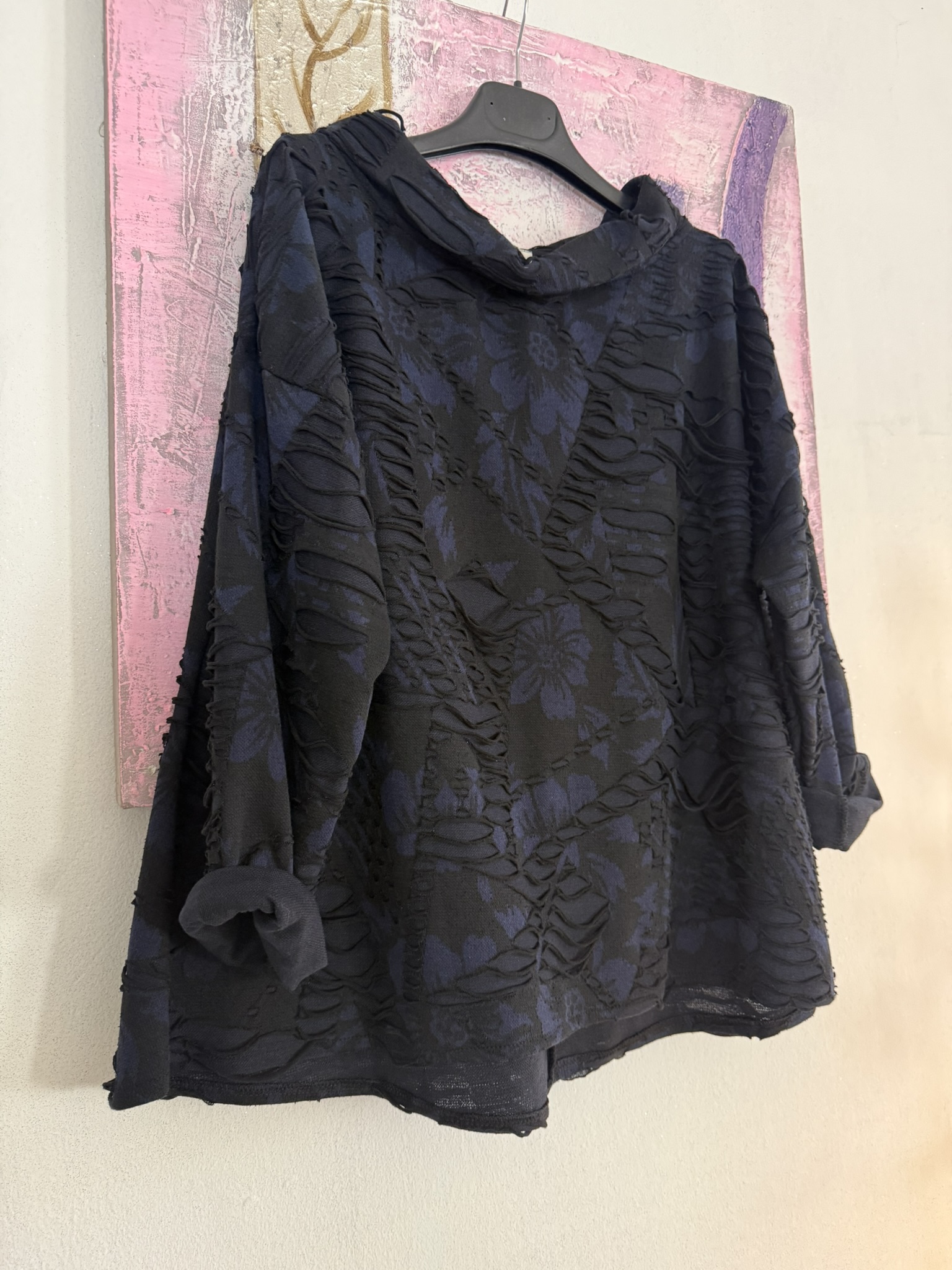 Blusa svasata, con collo a camicia, modello effetto strappato, vestibilità morbida, disponibile in taglia unica, veste fino alla taglia 48.