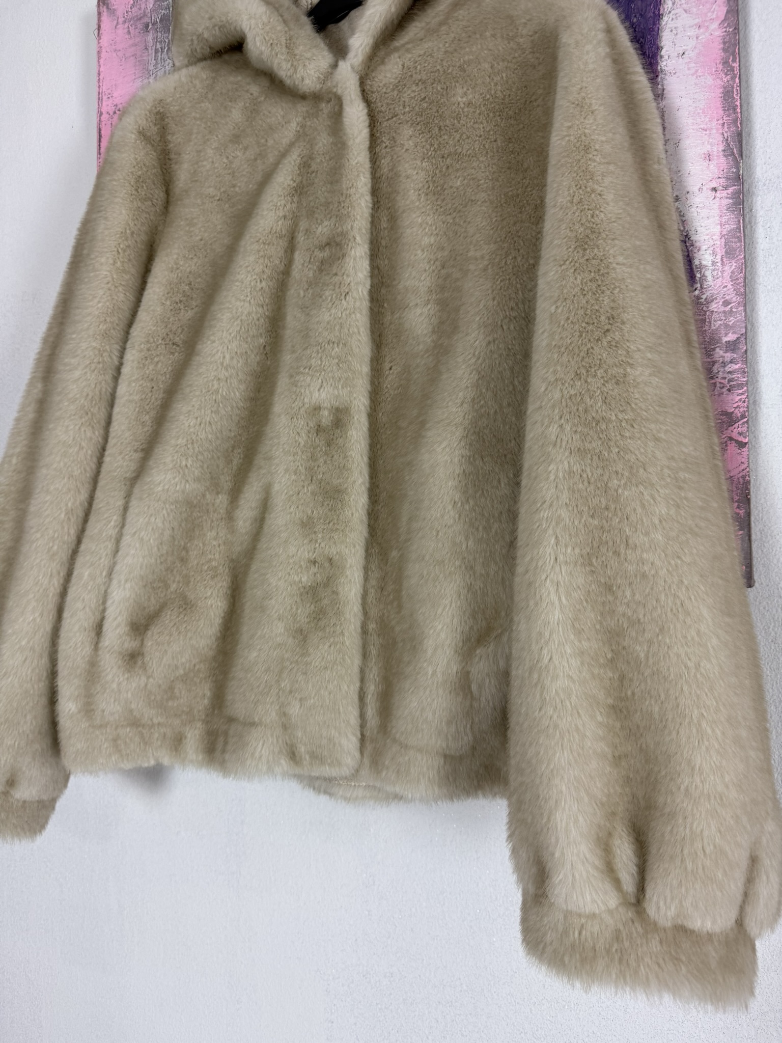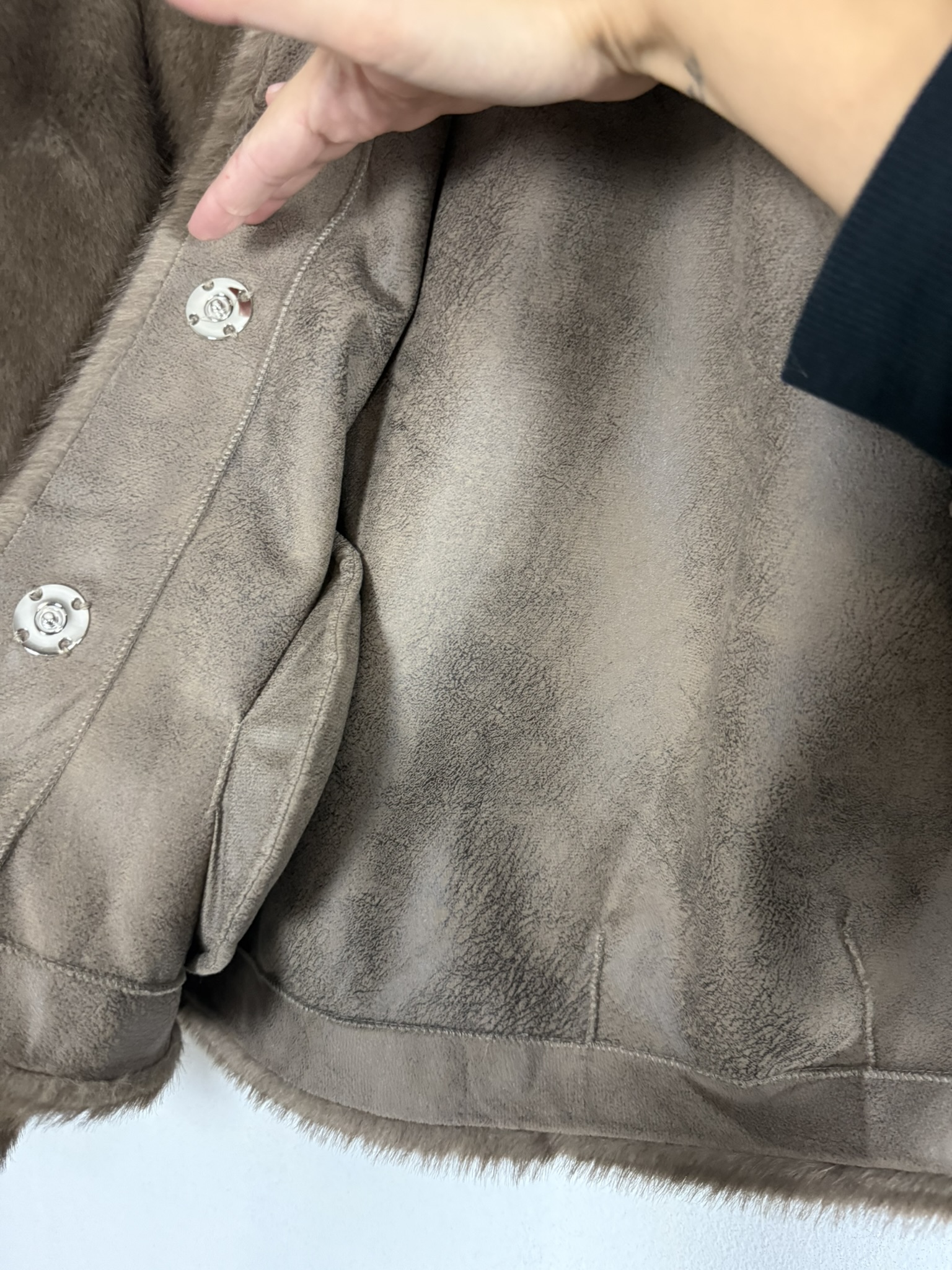 Eco pelliccia a pelo corto, chiusura con bottoni a clip e tasche laterali interne. La fodera interna è imbottita. Vestibilità fino alla taglia 46.