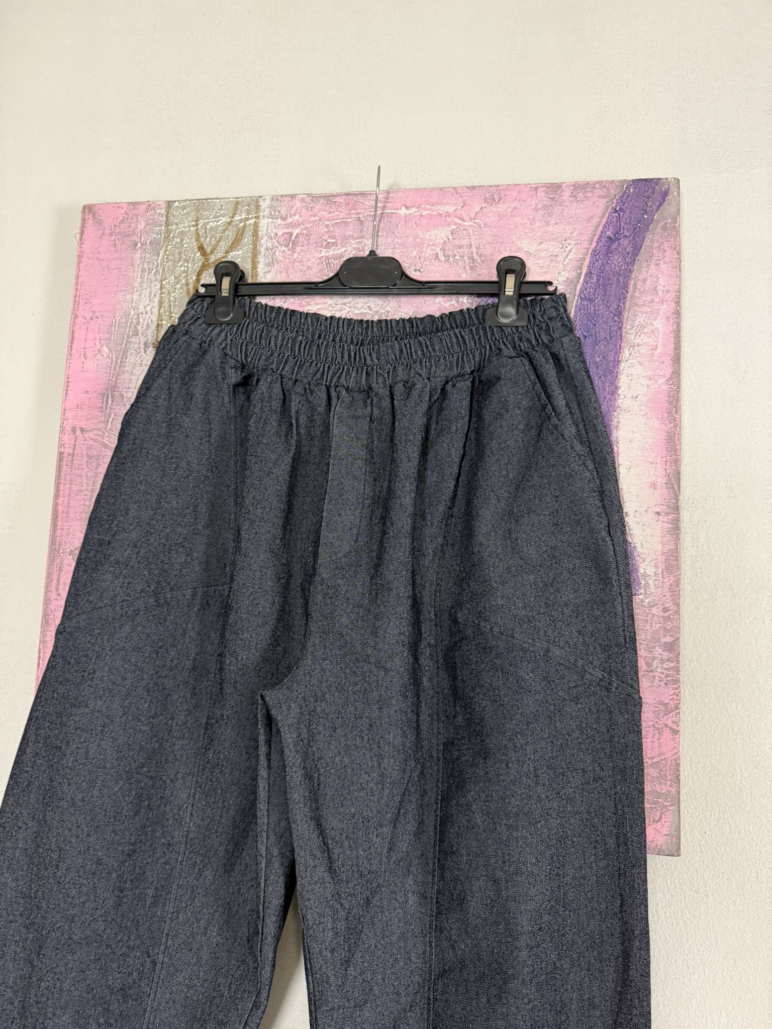 Jeans vestibilità morbida, con elastico in vita e tasche laterali. Disponibile in taglia unica, veste fino alla taglia 48/50.