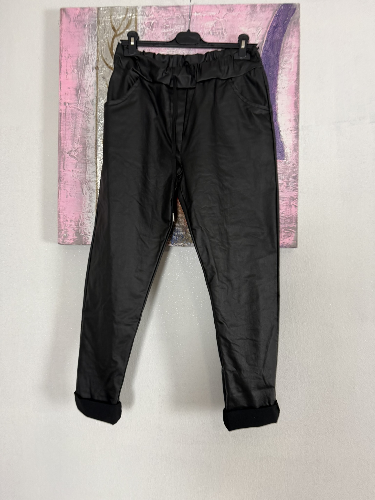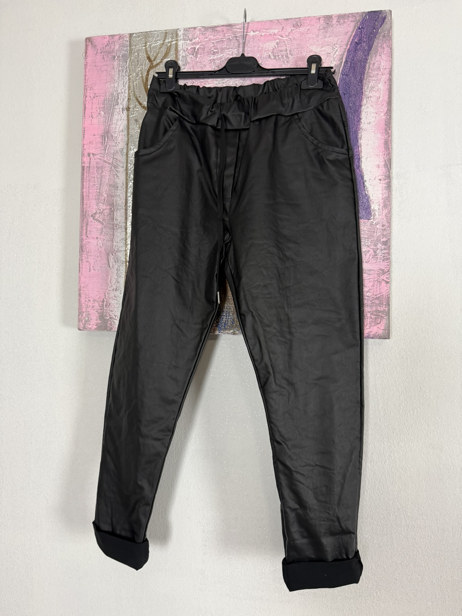 Leggings in ecopelle, leggermente imbottiti all’interno, per la stagione fredda, con elastico in vita, coulisse e taschine laterali. Disponibile in taglia unica, veste fino alla taglia L. Leggermente elasticizzati.