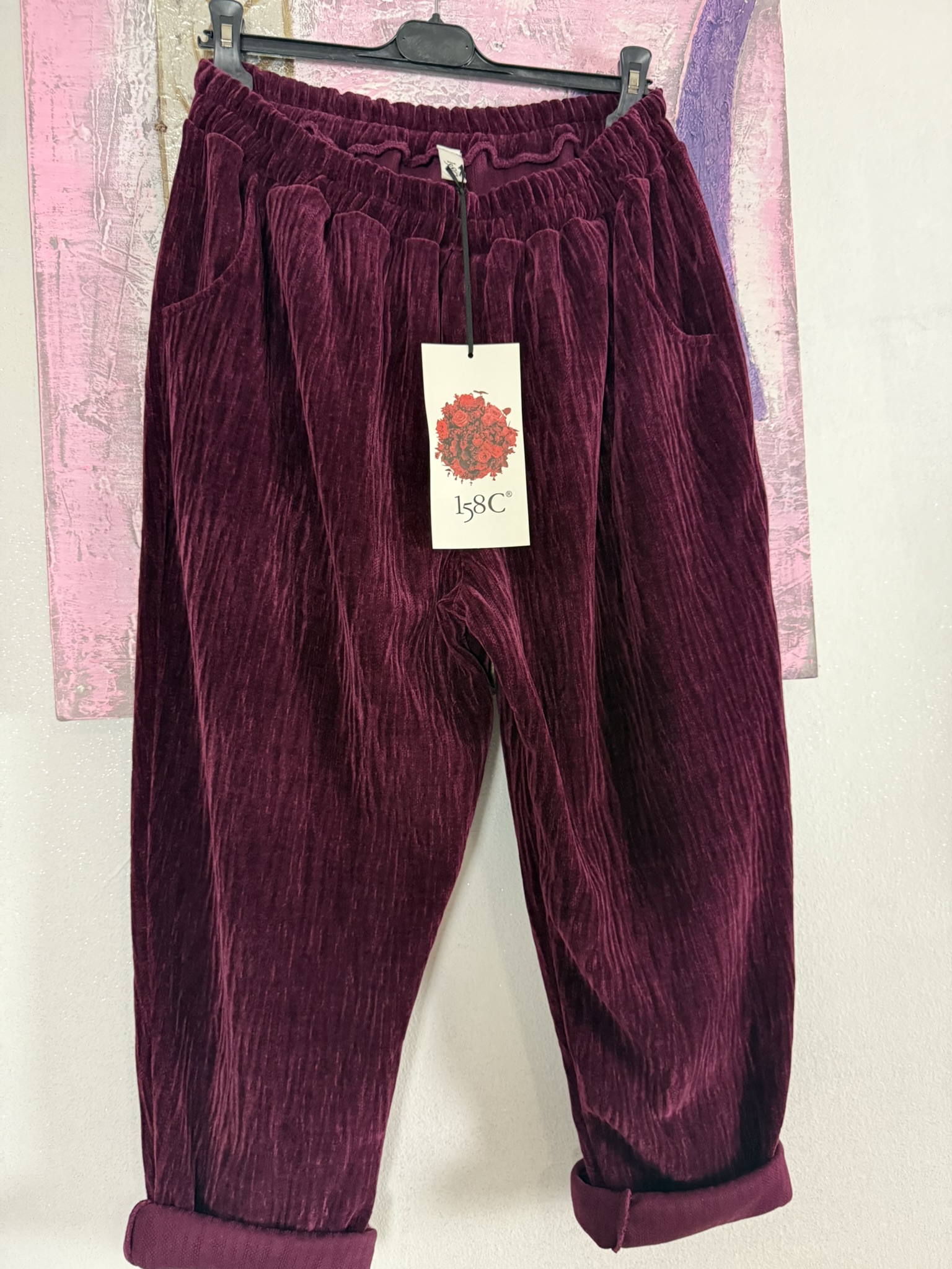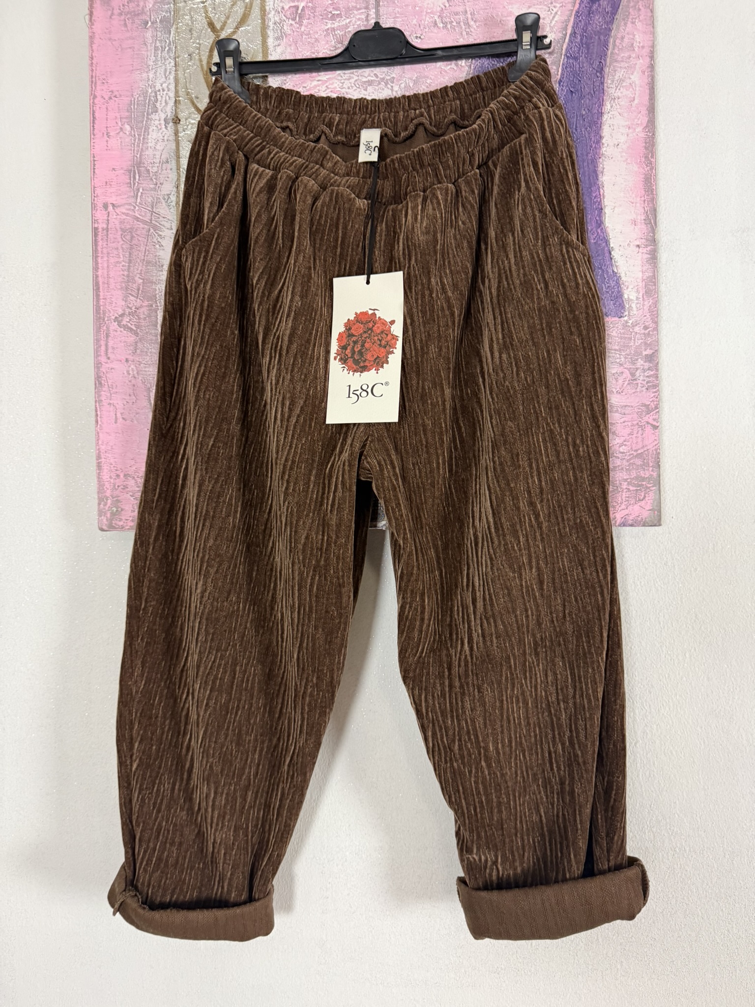 Pantalone vestibilità morbida, con elastico in vita, tasche laterali e taschine posteriori. Disponibile in taglia unica, veste fino alla taglia 48 comoda.
