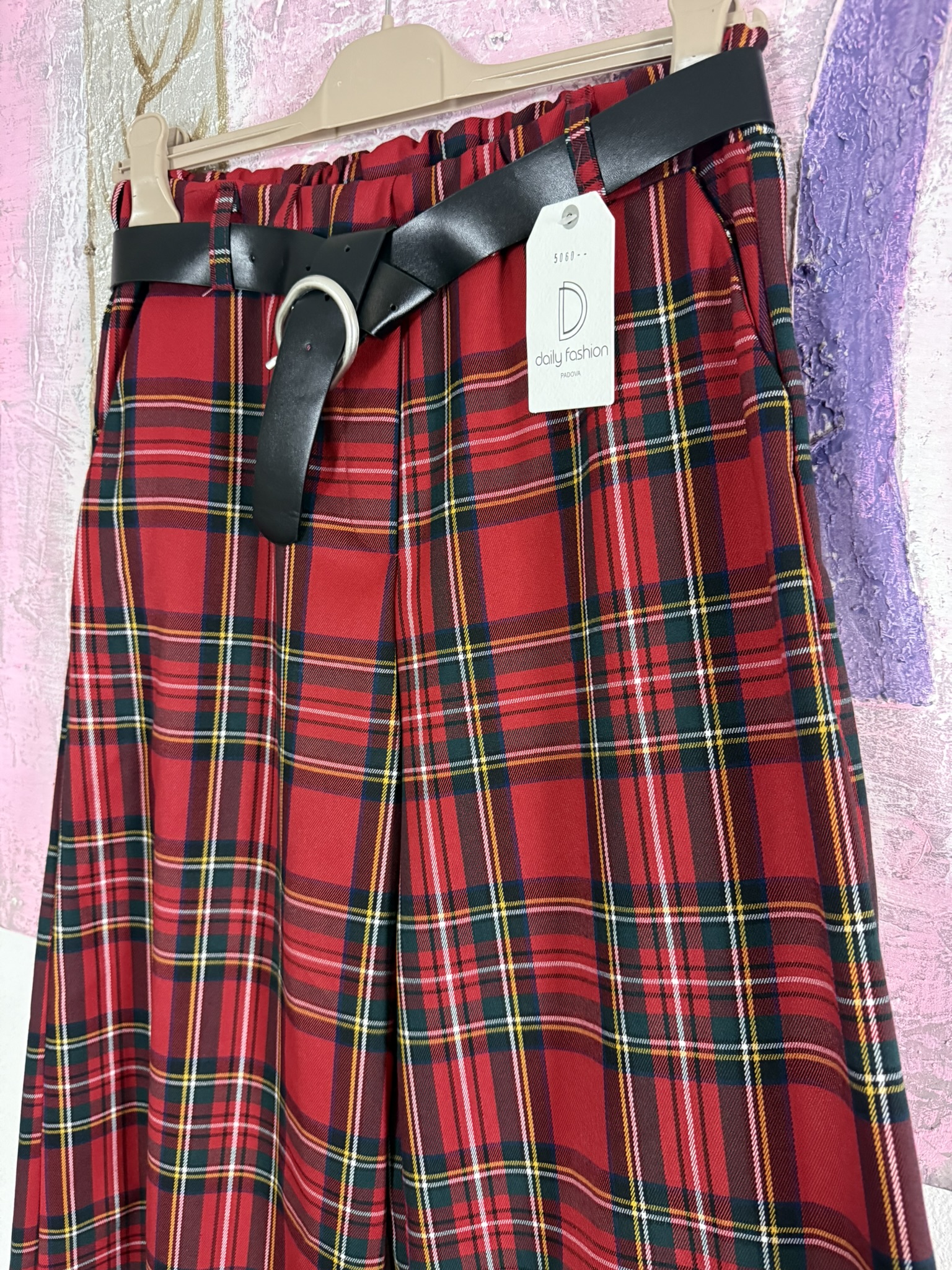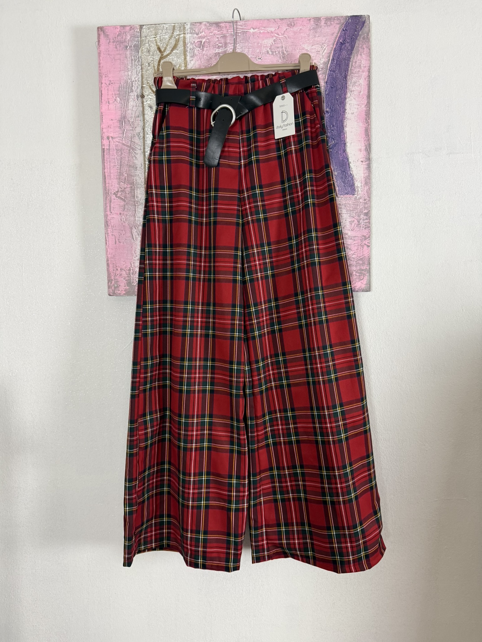 Pantalone a gamba larga, modello con elastico in vita e tasche laterali, con cintura in coordinato. Disponibile in taglia unica, veste fino alla taglia L comodo.