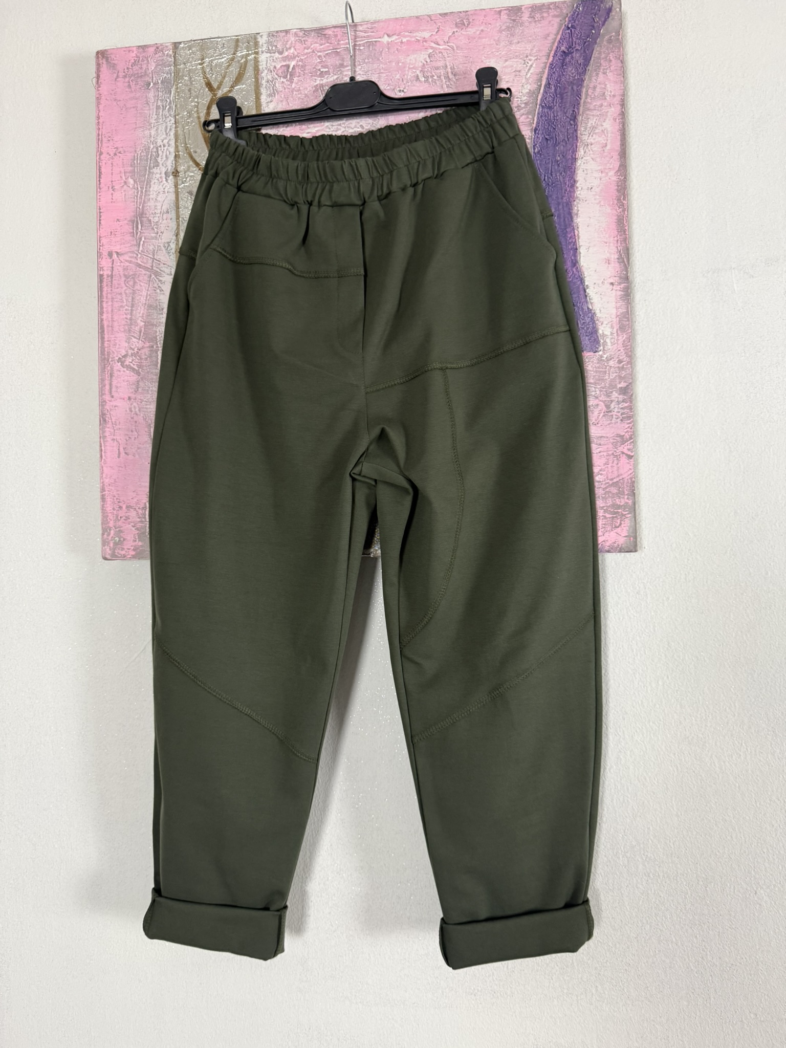 Pantalone in viscosa, ideale per la stagione autunnale, con elastico in vita e tasche laterali, con lavorazione sulla parte davanti. Disponibile in taglia unica, vestibilità fino alla taglia 46/48.